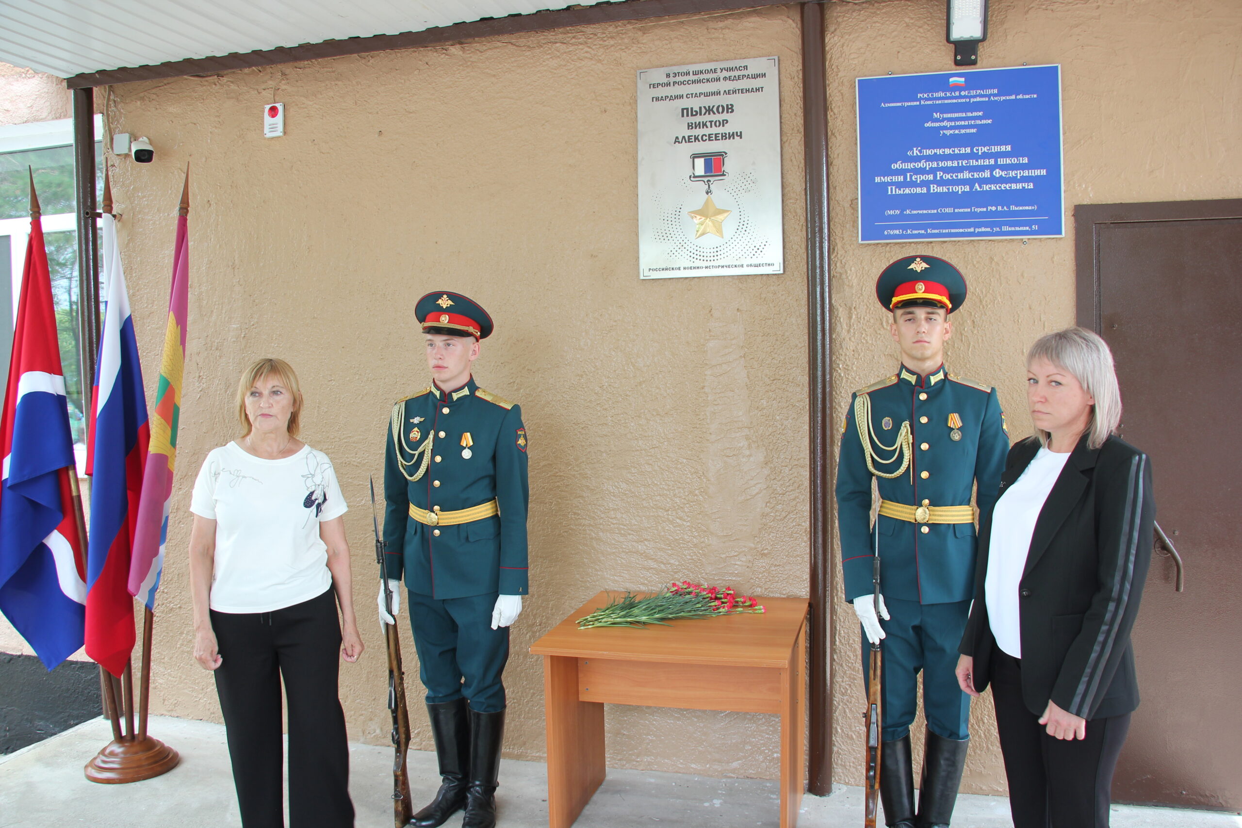На церемонии присутствовали почетные гости: заместитель председателя правительства Амурской области Алексей Севостьянов, начальник Дальневосточного высшего общевойскового командного училища генерал-майор Валерий Шарагов, глава района Александр Колесников, председатель районного Совета народных депутатов Нина Тарасенко, глава Ключевского сельсовета Юлия Кравченко, директор школы Татьяна Щербинина, первая учительница Виктора Алексеевича Пыжова Наталья Попова и другие.