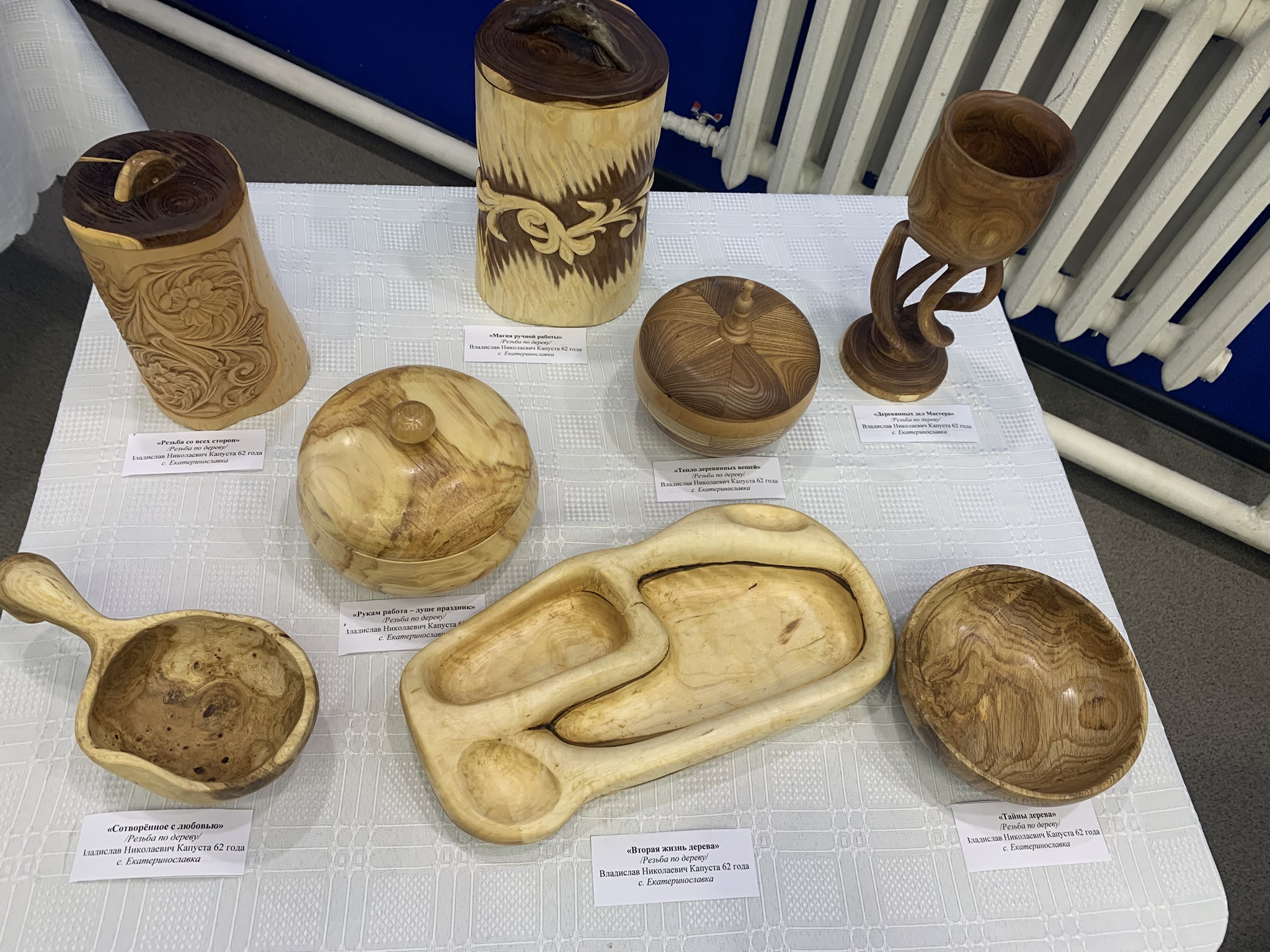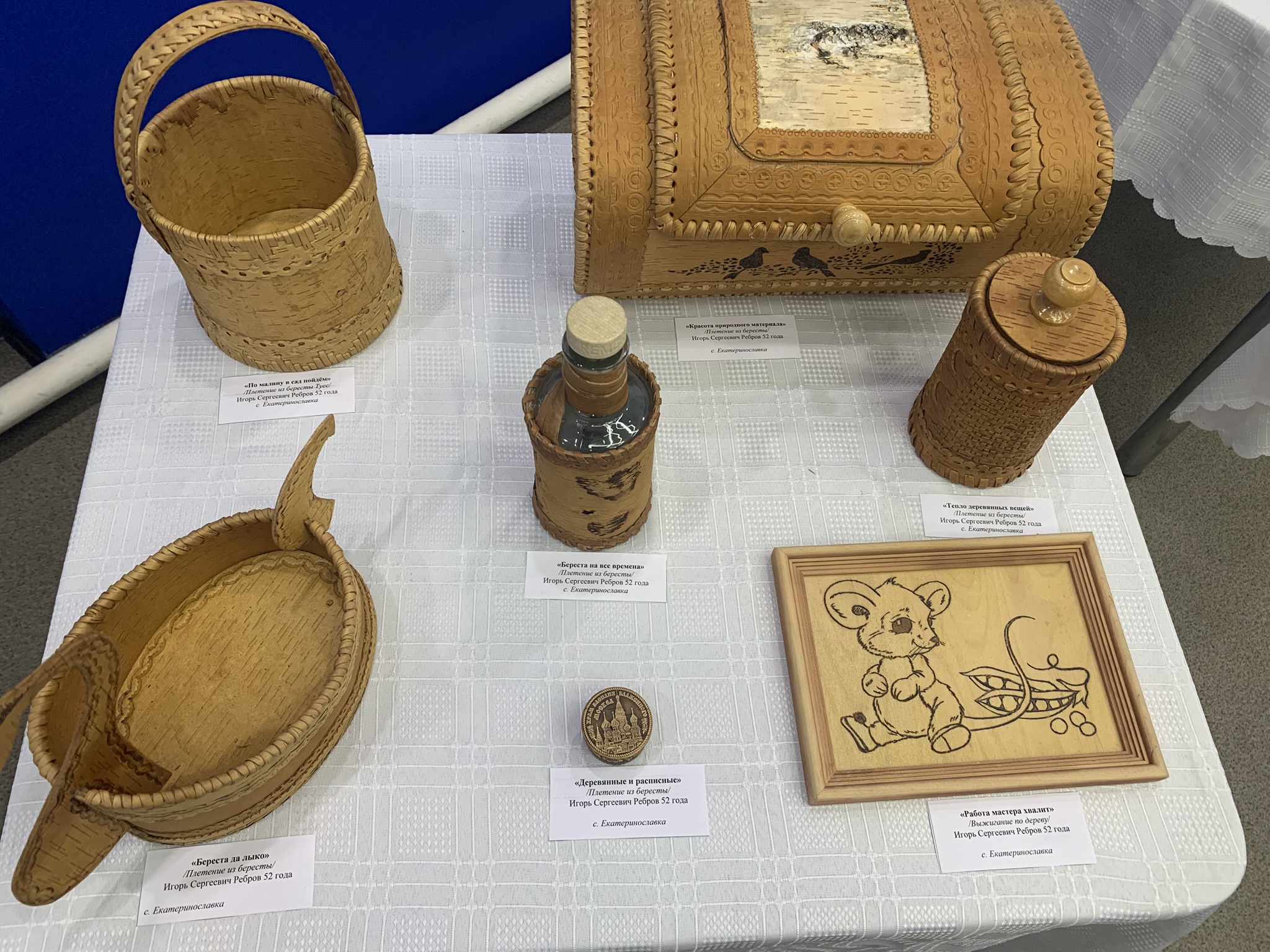 Присутствующие с интересов рассматривали работы Капусты Владислава Николаевича и Реброва Игоря Сергеевича из дерева и бересты, поражали изделия из пайеток и бисера, выполненные руками Левченко Надежды Александровны , Маремьяновой Елены Григорьевны, Брызгаловой Ольги Павловны; всех поразила шляпка от Соколовой Татьяны Григорьевны, выполненная из кукурузных листьев.