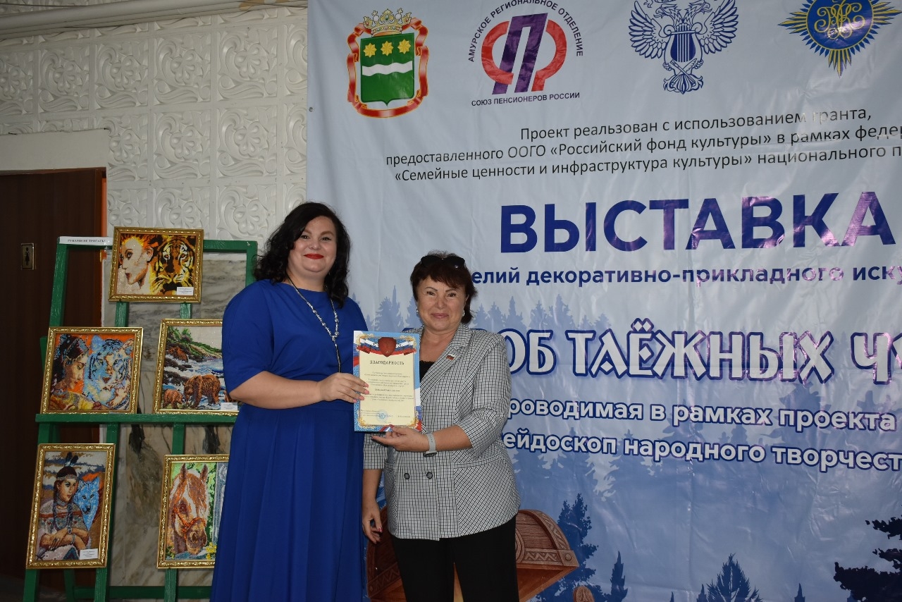Проект «Калейдоскоп народного творчества» реализован Амурским отделением ООО «Союз пенсионеров России» с использованием гранта, предоставленного ООГО «Российский фонд культуры» в рамках федерального проекта «Семейные ценности и инфраструктура культуры» национального проекта «Семья».