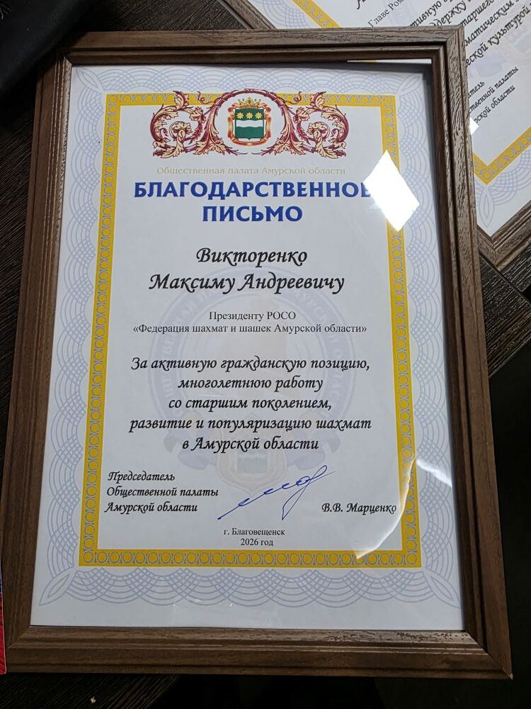 «С особым чувством признательности я вручаю Благодарственное письмо Общественной палаты Амурской области Опаленко Анатолию Андреевичу, главе Ромненского муниципального округа.- Мы видим, какую активную поддержку оказывает Анатолий Андреевич старшему поколению своего округа. Он – пожалуй, единственный глава округа, который лично участвует в спортивных мероприятиях в составе команды старшего поколения. Благодарю всех глав муниципальных образований, которые выделили шахматистам и группам поддержки транспорт для поездки на турнир, которые поддерживают старшее поколение в стремлении заниматься физкультурой и спортом.»