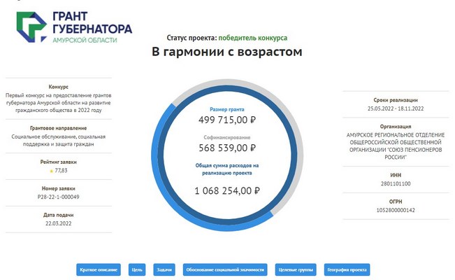 Проект «В ГАРМОНИИ С ВОЗРАСТОМ» АМУРСКОГО РЕГИОНАЛЬНОГО ОТДЕЛЕНИЯ ОБЩЕРОССИЙСКОЙ ОБЩЕСТВЕННОЙ ОРГАНИЗАЦИИ «СОЮЗ ПЕНСИОНЕРОВ РОССИИ» вошел в число победителей первого конкурса на предоставление грантов губернатора Амурской области на развитие гражданского общества в 2022 году в направлении «Социальное обслуживание, социальная поддержка и защита граждан».