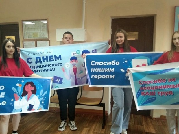 А после концерта юные волонтеры с баннерами в руках поприветствовали медиков-ветеранов и вручили им вкусные подарки.