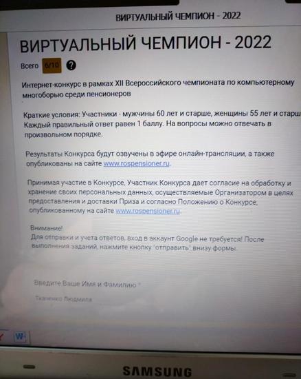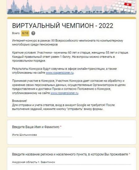 30 июня 2022 г. пенсионеры клуба компьютерной грамотности Завитинского МО СПР приняли участие в интернет — конкурсе для зрителей XII Всероссийского чемпионата по компьютерному многоборью среди пенсионеров «Виртуальный чемпион 2022».