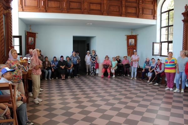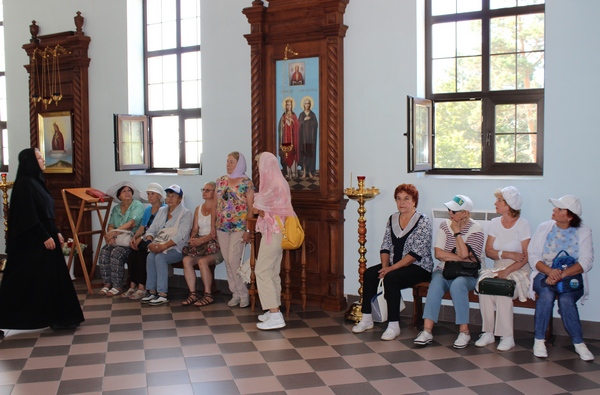 Сначала туристы-пенсионеры посетили Крестовоздвиженский женский монастырь, расположенный неподалеку от с. Егорьевка (в 40 км от г. Благовещенска) Амурской области. Здесь осмотрели красивые окрестности, посетили храм, где узнали об истории создания монастыря, а также о православных реликвиях, хранящихся здесь – частице Животворящего Креста Господня и части мощей преп. Марии Египетской и вмц. Варвары. Также туристы посетили церковную лавку, в которой помимо церковных атрибутов могли приобрести выпечку и овощные заготовки монастырских сестер.
