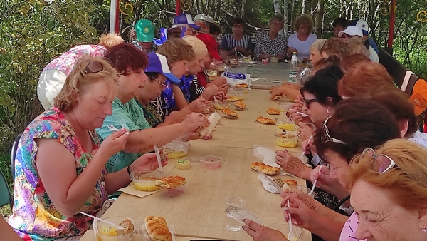 Пока наездники и животные обедали и готовились к выступлению, здесь состоялся обед на свежем воздухе, а после обеда туристы вспоминали песни молодости, в чем им помогал баянист.