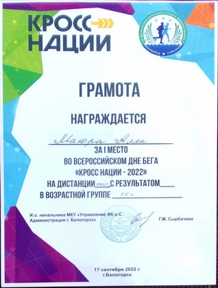 Алла Ивановна Маюра заняла 1 место на дистанции 1000 метров в возрастной категории 55+ , награждена грамотой и медалью.
