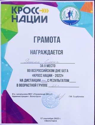 Елена Алексеевна Росина заняла 2 место на дистанции 1000 метров в возрастной категории 55+ , награждена грамотой и медалью.