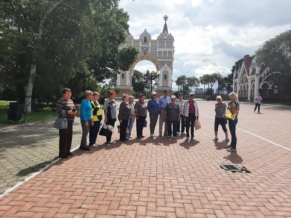 Продолжая гулять по городу, экскурсия направилась на набережную реки Амур. Людмила Ершова продолжала знакомить нас с достопримечательностями Благовещенска: памятником святителю Иннокентию, историей семьи и торгового дома «Чурин и Ко» (ныне центр эстетического воспитания детей им. В. В. Белоглазова, которому также установлен памятник), площадь Победы. Далее обзорная экскурсия прошла к Триумфальной арке, воздвигнутой в честь посещения города наследником Цесаревичем в 1891 году. Посетили Дом-музей купца Котельникова И.А. Интерьер – простой, а экспонаты интересными. Прикосновение к истории было волнительным.