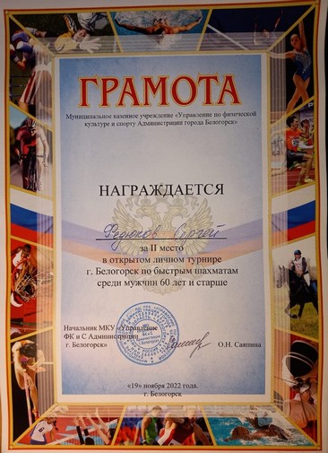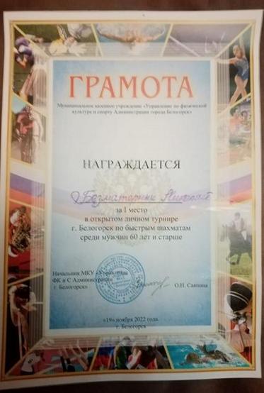 В субботу 19 ноября 2022 года команда из 3 мужчин, членов Белогорской Городской Общественной Организации «Союз Пенсионеров», приняла участие в открытом турнире по быстрым шахматам, который был организован Управлением по физической культуре и спорту Администрации города Белогорск.