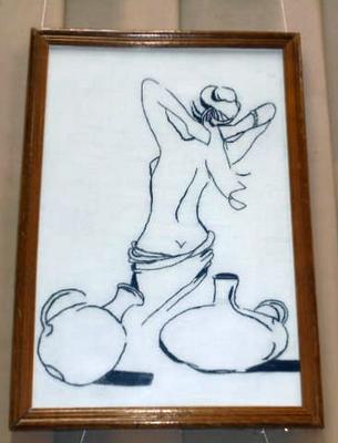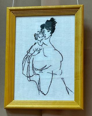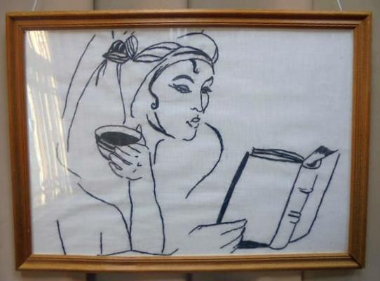 Основная часть работ выполнена в стиле монохромной контурной вышивки.