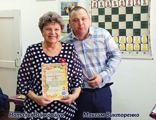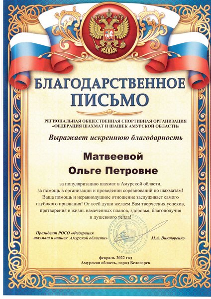 Благодарственное письмо председателю БГОО «СП» Ольге Петровне Матвеевой за популяризацию шахмат в Амурской области, за помощь в организации и проведении соревнований по шахматам вручил президент региональной общественной спортивной организации (РОСО) «Федерации шахмат и шашек Амурской области» Максим Андреевич Викторенко.
