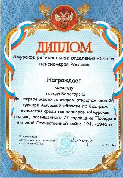 23 февраля 2022 в Белогорском городском Доме офицеров состоялось награждение участников второго открытого онлайн-турнира Амурской области по быстрым шахматам среди пенсионеров «Амурская ладья», посвященного 77-й годовщине Победы в Великой Отечественной войне, который проходил 06 февраля 2022 г.