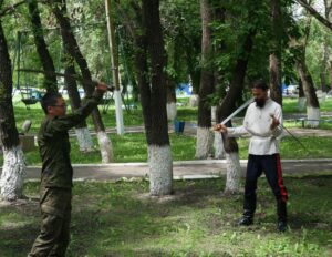 Ну и какой же праздник казачьей культуры без конников, без фланкировки ( искусства владения саблей)? На фестивале зрители смогли все это увидеть. Чудно было смотреть, как виртуозно владеют саблей не только взрослые, но и подростки. Не обошлось и без выставки оружия. Каждый мог примерить на себя и каску, и автомат.