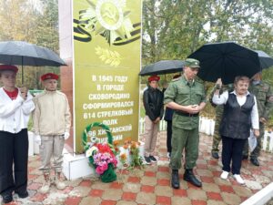 В рамках гранта губернатора Амурской области «Воспитываем патриотов России» пенсионеры города Сковородино- члены союза пенсионеров России провели митинг у обелиска в честь 614 полка 396 дивизии ( второго формирования), сформированного в городе Сковородино.