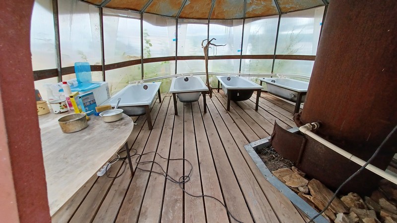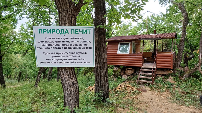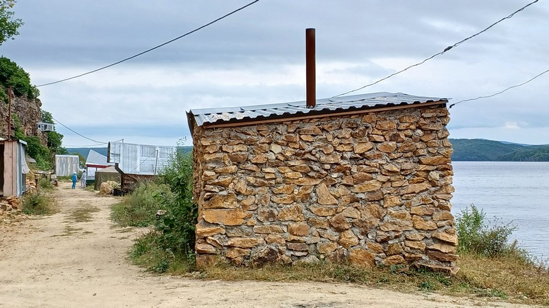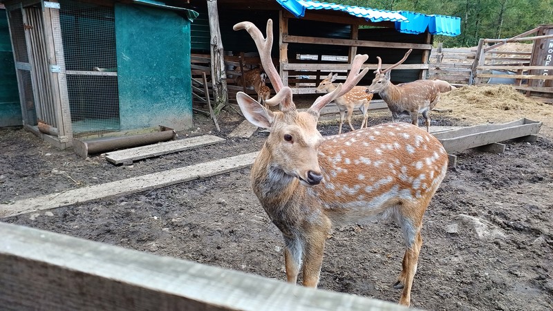Здесь туристов встретил основатель турбазы Владимир Пинегин, который рассказал о возникновении идеи и истории создания этого уникального комплекса, провел инструктаж и небольшую ознакомительную экскурсию. Турбаза расположена в зоне тектонического разлома, поэтому здесь есть места выхода горячего воздуха из земли. Здесь царит природа, и раздолье птицам и животным, по рассказу Владимира Павловича, сюда даже наведывалась тигрица.