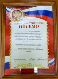 Торжественно была зачитана Благодарность членам организации БГОО «СП» от волонтёров объединения «Армейская посылка» города Белогорск: «Сердечная благодарность за оказание гуманитарной помощи и плетение маскировочных сетей для участников Специальной Военной Операции».