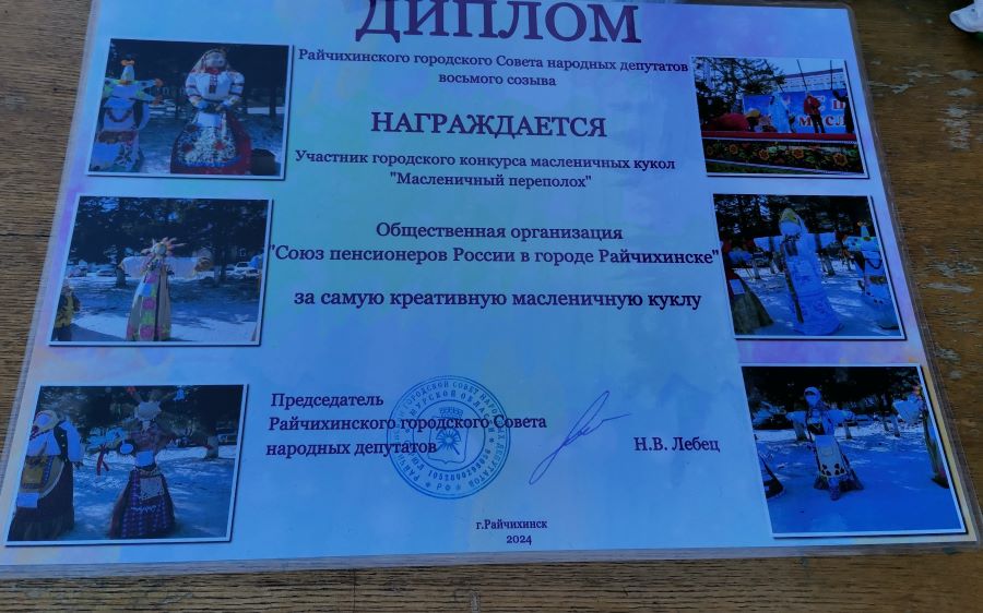По результатам конкурса на лучшую масленичную куклу-чучело наша организация заняла почетное 3-е место, и также была награждена дипломом Райчихинского городского Совета народных депутатов «За самую креативную масленичную куклу».
