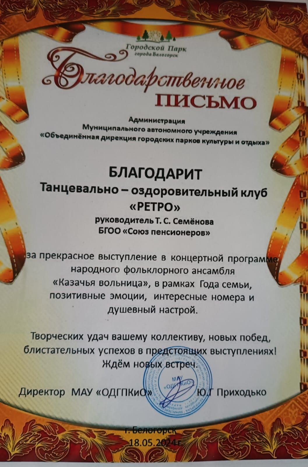 18 мая в городском парке культуры и отдыха города Белогорск состоялся праздник, посвященный «Году семьи». Белогорская Городская Общественная Организация «Союз Пенсионеров» приняли активное участие. Многие пришли семьями. Были подведены итоги конкурса «Детский рисунок». и выступили коллективы «Казачья вольница» и «Ретро». Каждый коллектив получил благодарственное письмо.