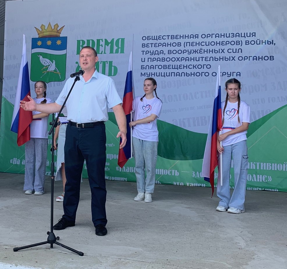 От имени депутатов Благовещенского муниципального округа Матвеев Сергей Александрович, председатель совета, приветствовал участников слета, пожелал всем здоровья, позитивного настроения и подольше служить для молодого поколения примером бодрости, энтузиазма, позитивного отношения к жизни.