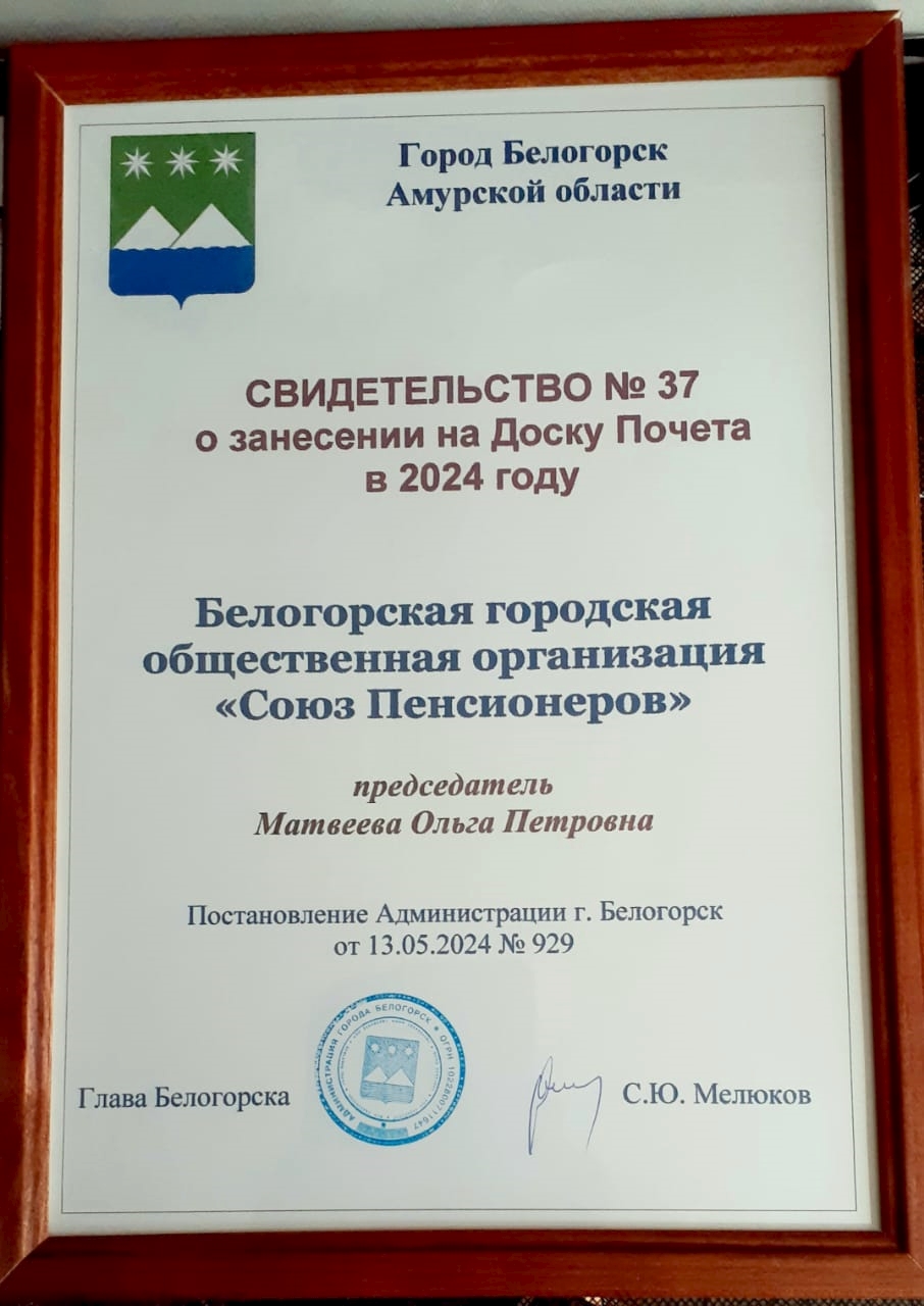 Вот такое радостное событие у Белогорского союза пенсионеров. От всей души поздравляем ваш коллектив. Вы — активны, позитивны, спортивны, талантливы. Вы — пример не только для всех белогорских пенсионеров, но и для всех местных отделений Амурского союза пенсионеров! Новых вам творческих свершений, побед на спартакиадах пенсионеров и на олимпиадах «Интернет-долголетия», задора и бодрости для новых интересных дел!