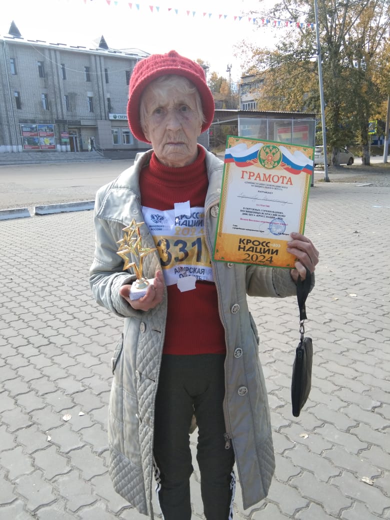 21 сентября пенсионеры г. Сковородино приняли участие в забеге «Кросс нации». Погода в этот день радовала участников своим осенним солнышком т настроение у всех было отличным! Все получили заряд положительных эмоций и море впечатлений! Самым возрастным участником была 84-летняя Ефимова Валентина Васильевна, которая получила специальный приз-статуэтку и грамоту.