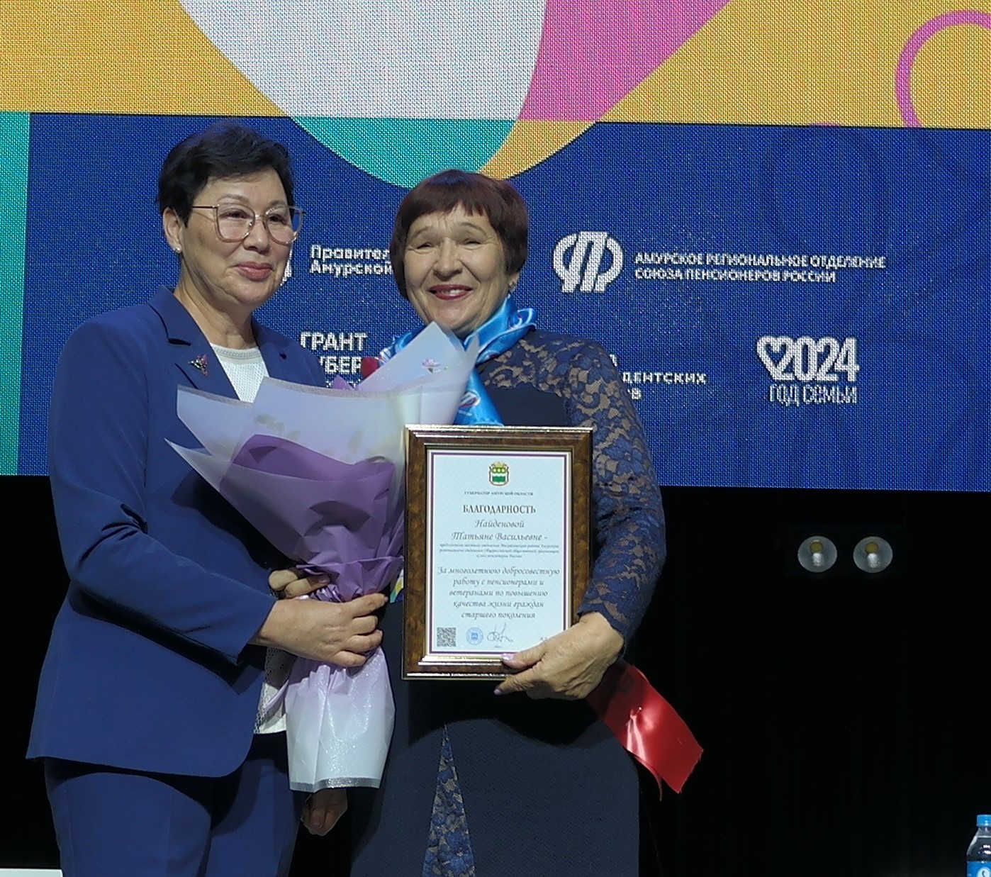 Лановая Галина Васильевна из Михайловского района и Чигарева Галина Артемьевна, председатель местного отделения СПР Серышевского муниципального округа награждены знаком «Почетный пенсионер».