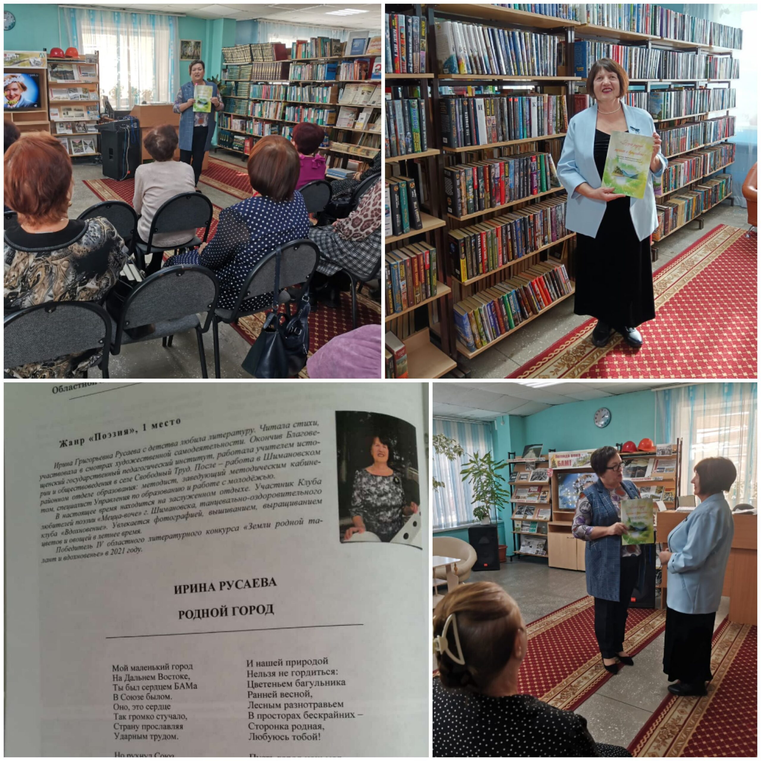 Члены Шимановской организации СПР посетили интересное мероприятие в городской библиотеке – награждение победителей пятого литературного конкурса «Земли родной талант и вдохновенье». Конкурс проводится раз в два года с 2015 года, Шимановцы принимают в нем участие и занимают призовые места. В этот раз среди 57 участников победителем в номинации «Поэзия» стала член Шимановского отделения СПР Русаева Ирина Григорьевна за стихотворение «Родной город».