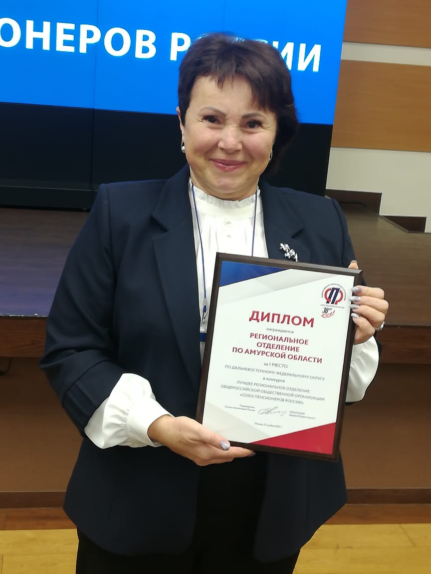 27 ноября в Москве на съезде союза пенсионеров Ольге Владимировне Колесниковой, председателю Амурского регионального отделения Общероссийской Общественной организации «Союз пенсионеров России» вручен диплом за 1 место по Дальневосточному Федеральному округу в конкурсе «Лучшее региональное отделение». Уже второй год Амурское региональное отделение занимает лидирующие позиции в этом конкурсе: в прошлом году амурчане были вторыми. «Это-, сказала Ольга Владимировна,- результат слаженной и целенаправленной работы всех местных отделений, каждого активиста нашего союза, каждого руководителя клуба или кружка, чтобы жизнь пенсионеров — членов нашего союза была интересной, насыщенной, полезной.»