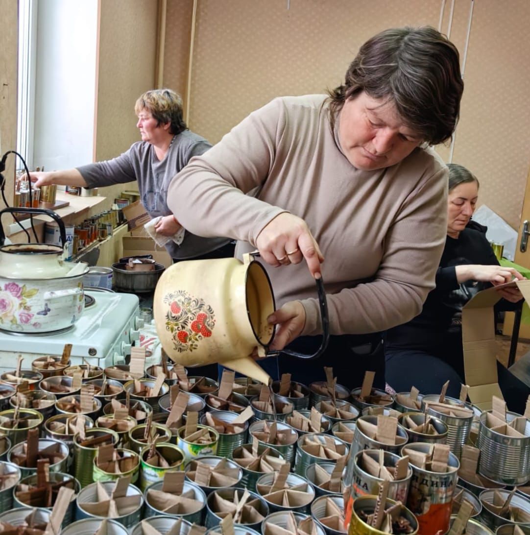 Начали свою работу со сбора средств, а уже на собранные деньги закупили парафин и приступили к изготовлению окопных свечей. Банки собирали отовсюду: приносили односельчане, привозили из города. Делать свечи помогали школьники, учащиеся казачьего колледжа.