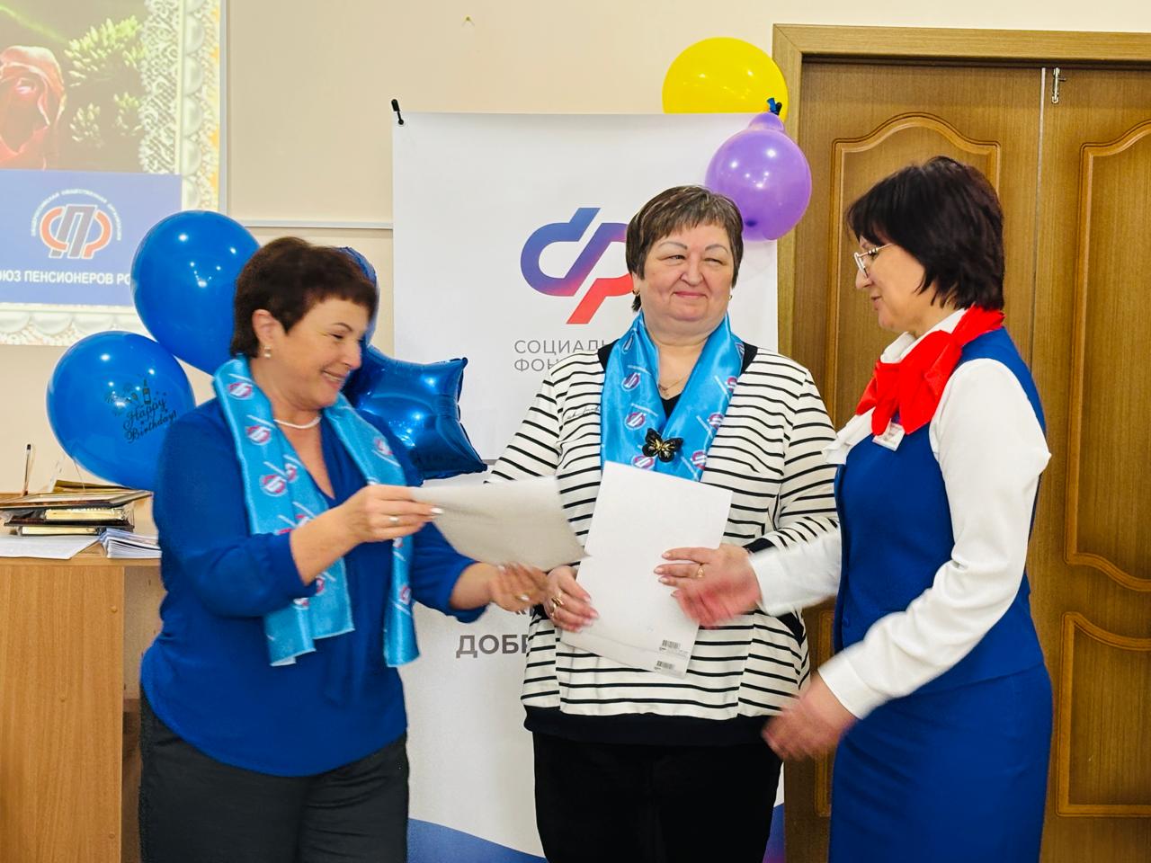 Как и принято на день рождения, были не только теплые поздравления, но и, конечно же, подарки! Председатель Амурского регионального отделения союза пенсионеров Колесникова О.В. вручила мобильную аудиосистему для вновь созданного танцевального коллектива.