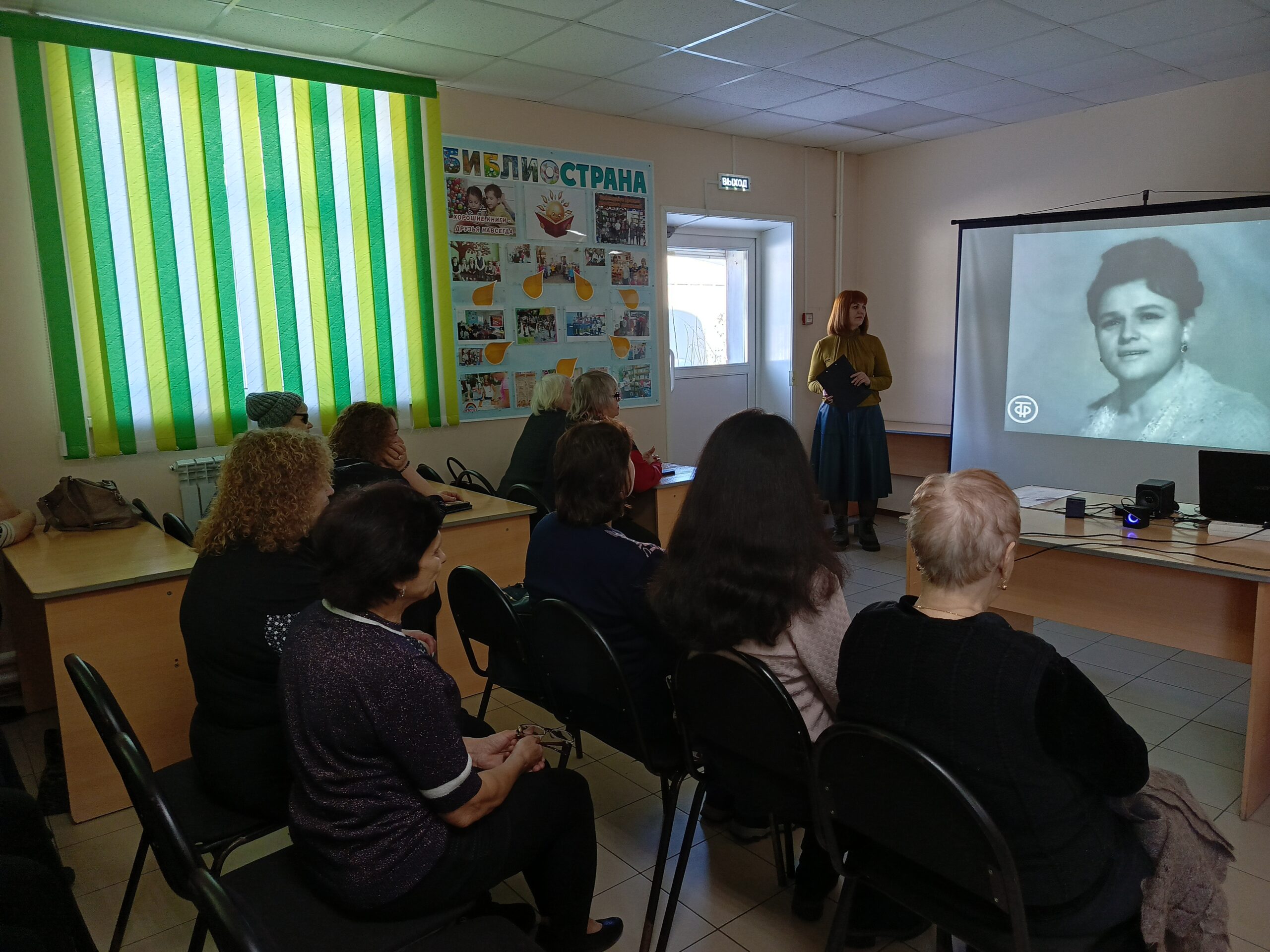 Присутствующие услышали задушевный рассказ о жизни и творческом пути великой певицы. Ее мягкое и тембристое меццо-сопрано звучало в течение всей встречи. С помощью мультимедийной презентации были представлены песни из репертуара «мисс Волга» (так называли Зыкину за границей): «Оренбургский пуховый платок», «Течет река Волга», «Ивушка зеленая», «Темно-вишневая шаль», «Тонкая рябина», «Ой, снег-снежок». Живой голос певицы никого не оставил равнодушным.
