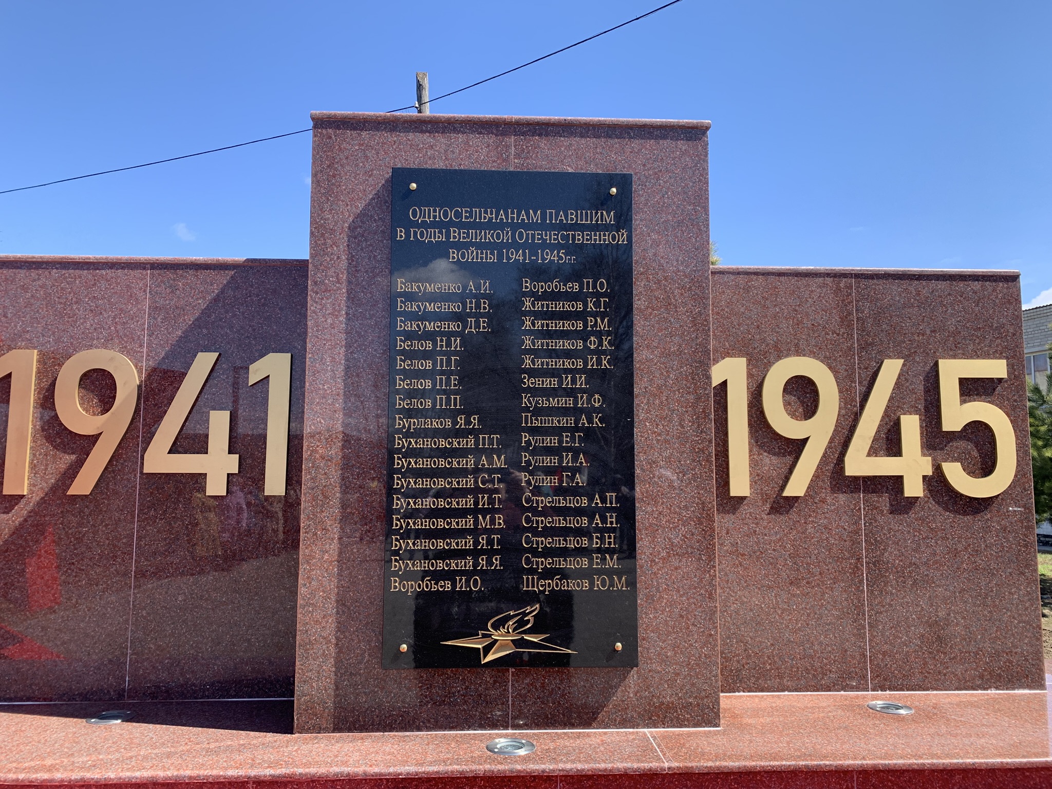 На памятной доске увековечены фамилии 32 человек, сложивших свои головы на войне. В тяжелейшие для страны годы они не думали о собственном благополучии. Уходили защищать и не возвращались. Были семьи, в которые не вернулся ни один из ушедших на фронт мужчин.