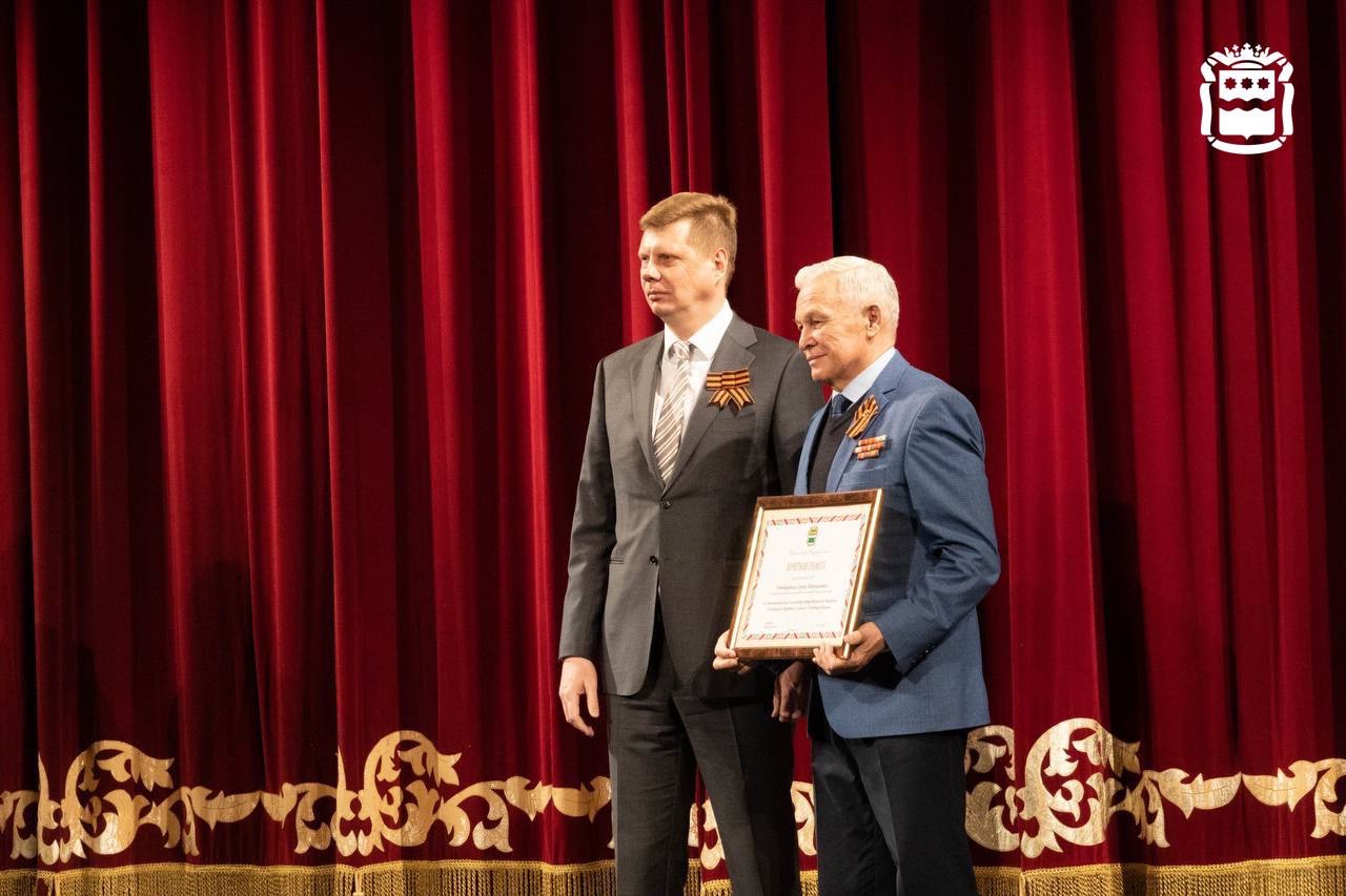 В честь 80-летия Победы Андрей Дюмин вручил Почетную грамоту Правительства области за вклад в развитие патриотического движения Сергею Утенбергенову, председателю Ассоциации пожилых людей.